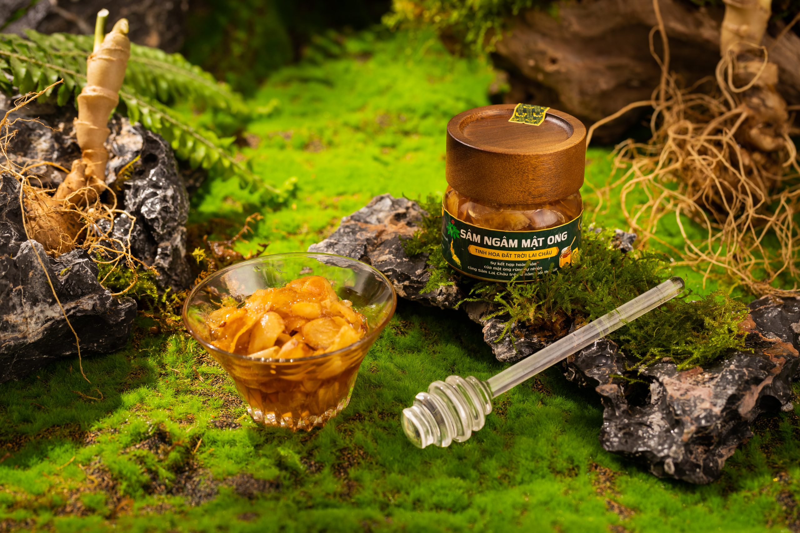 Huyền Linh Lục Trà là sự pha trộn tinh tế giữa củ Sâm Lai Châu thái lát trên 6 năm tuổi và mật ong rừng tự nhiên. Vị ngọt dịu nhẹ của mật ong hòa quyện với vị đắng hơi the đặc trưng của sâm, mang đến một dư vị khó quên cho người thưởng thức.